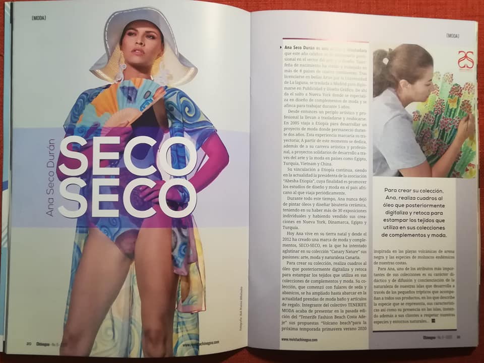 Como sabes, en 2012 creé mi propia marca ‘Seco-Seco’. Diseño, produzco y comercializo colecciones de complementos de moda, usando como base mis cuadros inspirados en la naturaleza canaria. Responde, ello, a la necesidad de tener un medio de vida y poder garantizarme una jubilación, ya que como voluntaria no se cotiza y tampoco se cobra… (en este momento se ríe alegremente). Después de ocho años dedicada a la cooperación en tantos países, llegó la hora y la necesidad de pensar en mi futuro. Igualmente, dicha marca (SECO-SECO) me posibilita seguir trabajando en cooperación y solidaridad e, incluso, varios de los productos que vendo me los realizan en Etiopía.