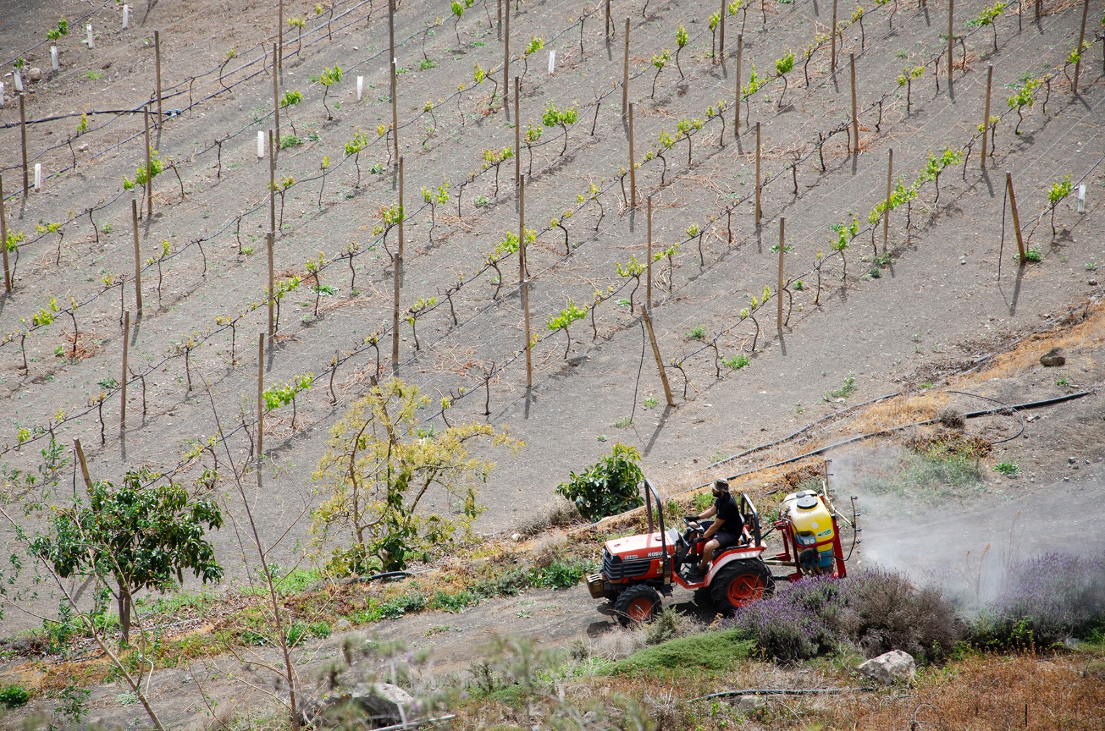 Desde que me saqué el carné con 18 años iba a recolectar uvas en muchas fincas porque no teníamos suficientes en las fincas de Bandama. Había hombres que decían: «¡Cómo trabaja esta chica y cómo carga!». Yo preguntaba: «¿Por qué no?». Y mi padre les decía: “Tú no sabes quién está ahí” (Ríe). O me cerraban la puerta y no me dejaban entrar en las bodegas, eso lo he vivido desde chiquitita. La mujer iba solo a vendimiar, a recolectar la fruta, el resto era un trabajo del hombre, pero ahora, por suerte, cada vez hay más mujeres en viticultura, en enología, sumillería. Sin embargo, para mí el campo es la parte fundamental porque si no trabajas bien la viña, olvídate de sacar un vino bueno; el vino se hace en la viña.